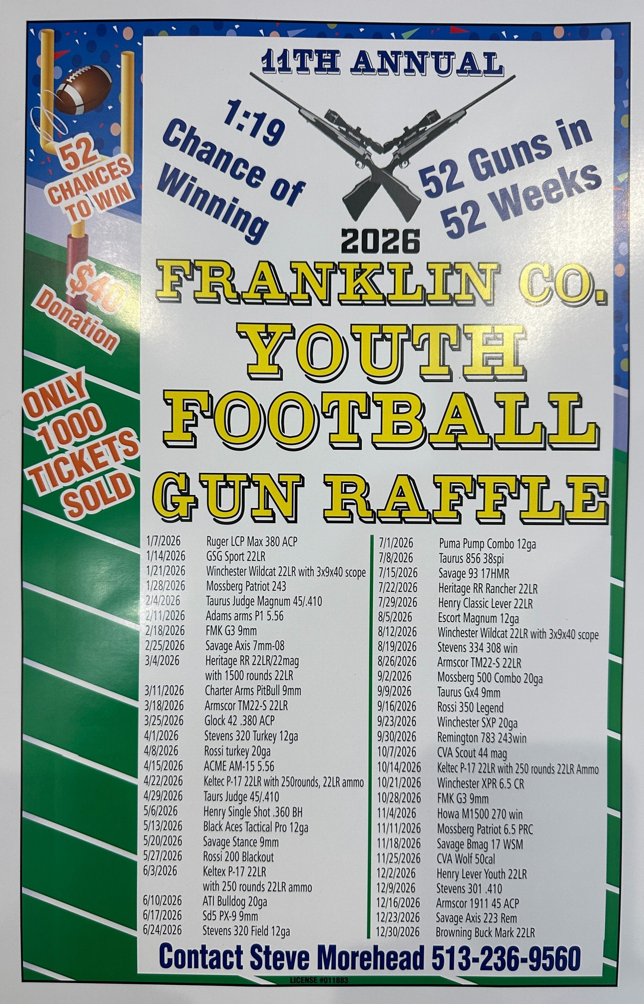 Only 1,000 tickets will be sold, so grab yours now for a 1 in 19 chance of winning each week! You don't need to be present to win, and we'll contact the winners. All proceeds support Franklin County Youth Football.