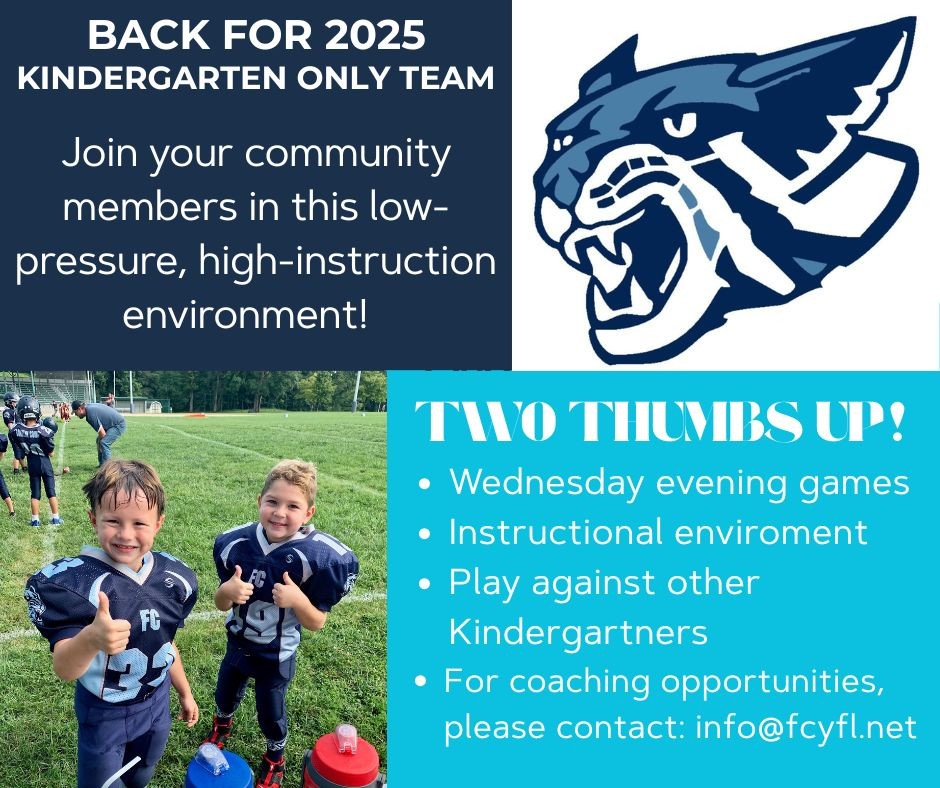 Back for 2025! Franklin County Youth Football is excited to announce the return of an instructional team just for kindergarteners! This is a great opportunity for young athletes to learn the fundamentals of football in a fun, low-pressure environment.